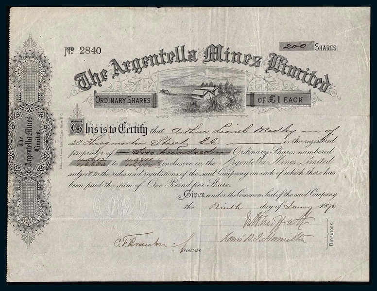 France: Corsica: Argentella Mines Ltd., £1 ordinary shares, 18[90], no.2840, mine building at top, scrollwork at left, black, very fine.