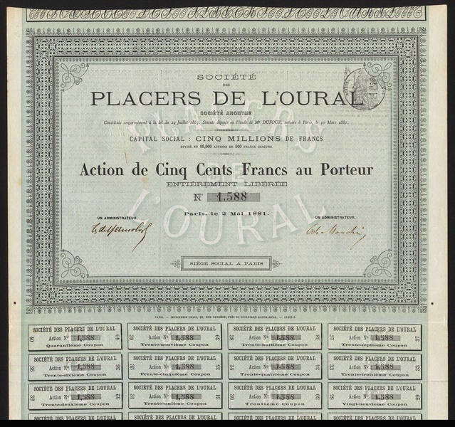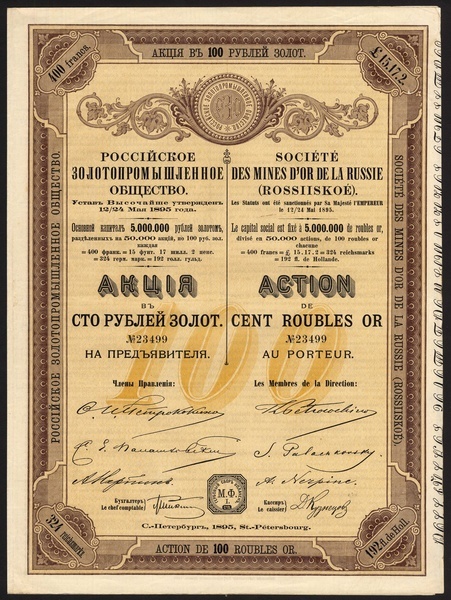 Russian Mining, comprising; Societe des Mines d'Or de la Russie, 100 rouble share, 1895, brown; Societe des Mibnes d'Or de la Lena, 150 rouble share, 1912, red; S.A. des Mines d'Or d'Ouspenski (Oural), 100 franc share, no.1, 1898, blue and yellow; Societe des Placers de L'Oural, 100 franc share, 1881, green; Mines d'Or d'Ouralsk-Troitsk, 100 franc share, 1898, blue and peach; S.A. Mines d'Or du Katchkar, bearer share, 1897, brown; Nederlandsch-Siberische Goudvelden-Maatschappij "Minoessinsk", 250 gulden share, 1899, olive; Societe de Kamyszeff pour l'Exploitation de l'Or, 500 franc share, 1899, blue, and Mines d'Or de Verchne-Ouralsk, bearer share, 1900, black on buff, generally very fine. (9)