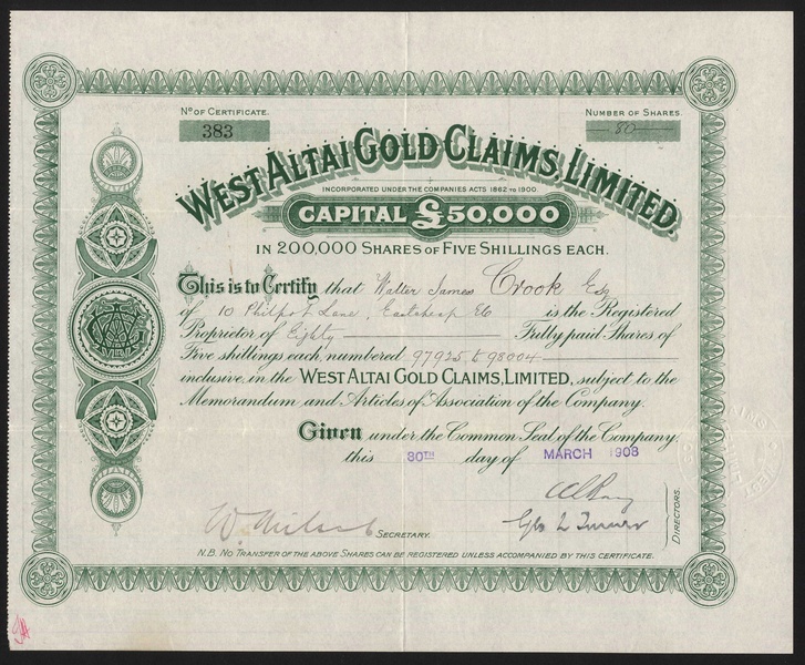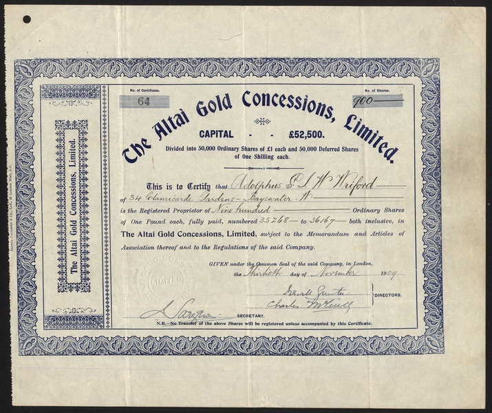 Russia: West Altai Gold Claims Ltd., 5 shilling shares, [1908], no.383, ornate border, green, together with; Altai Gold Concessions Ltd., ordinary shares, 19[09], no.64, ornate border, blue, and Orsk Goldfields Ltd., £1 shares, 190[7], no.2050, ornate border, blue with pink underprint, the second with punch hole at top, otherwise all good very fine. (3)