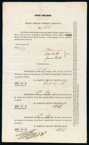 Brazil: Minas Geraes Mining Co., certificate for 5 shares of £20, London 1836, no.568, black, receipted for 3 payments totalling £5 per share plus handstamp for another £1 call made in 1839, very fine to extremely fine.