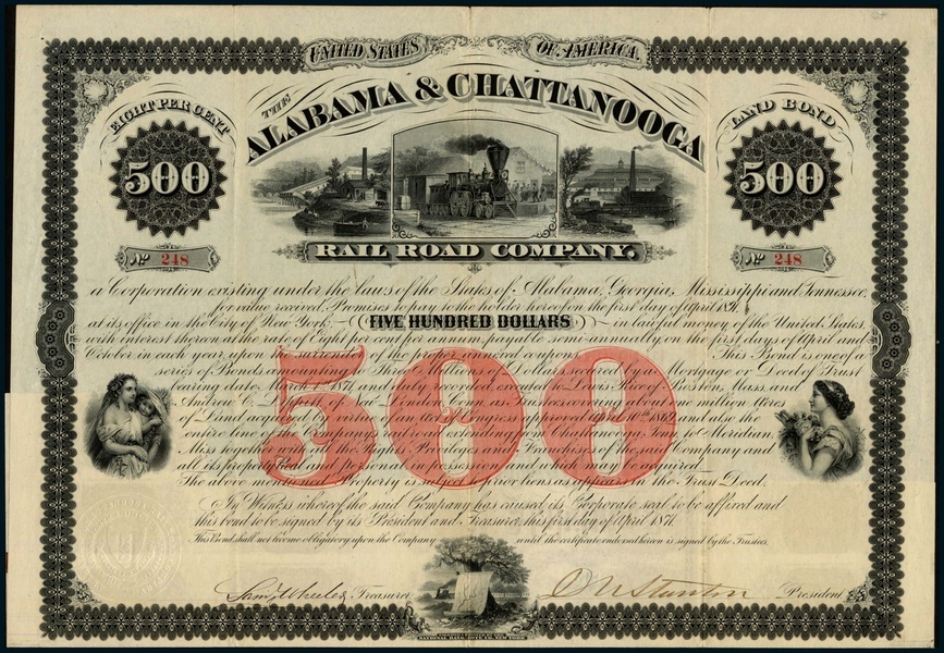 Alabama & Chattanooga Rail Road Co., (AL), 8% land bond for $500, 1871, no.248, steam engine with factory scenes at top, allegorical females to left and right, black with red underprint, with coupons, very fine.