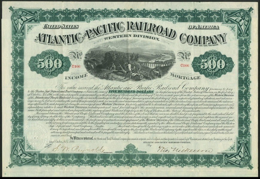 Atlantic and Pacific Railroad Co. Western Division, a group of certificates comprising; income mortgage bonds for $50, $100, $500 and $1000, all 1880, agricultural scene with train passing behind at top, ornate border, red, blue, green and brown respectively, and, first mortgage 6% gold bond for $1000, also 1880, allegorical figures at top, ornate border, grey, all with coupons, all very fine. (5)