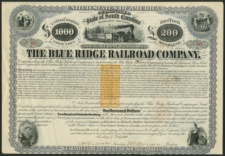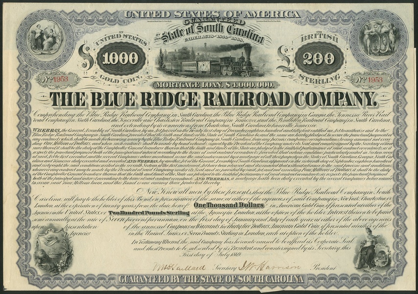 Blue Ridge Railroad Co., (SC), a pair of mortgage bonds for $1000 or £200, both 1869, no.817 and 1953, one has an orange imprinted revenue stamp, one is without, decorative border with allegorical figures in corners, steam train at top, blue and black, both with coupons, both cut cancelled, very fine and good very fine respectively. (2)