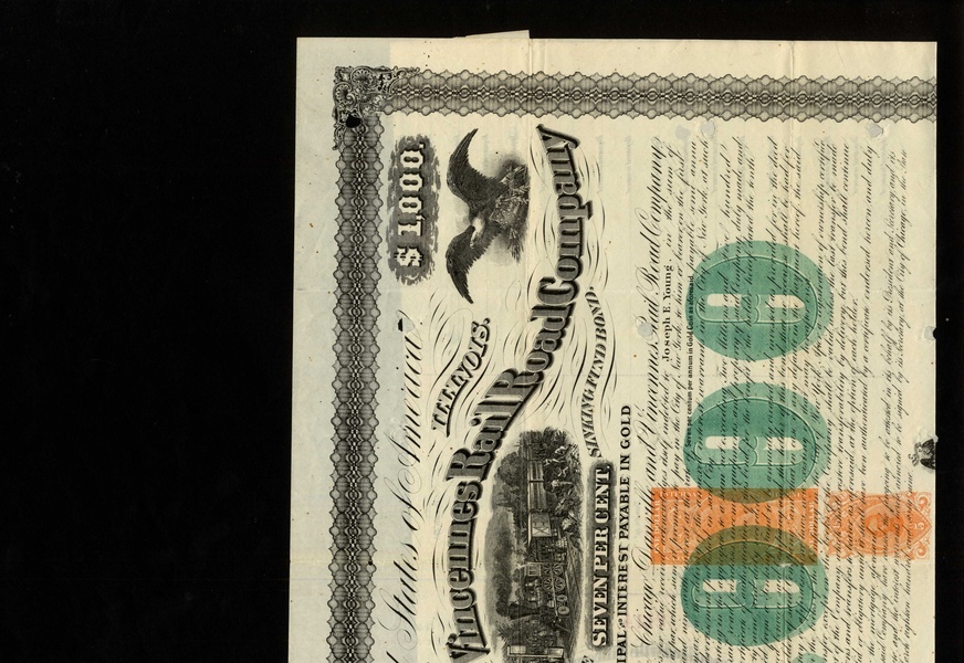 Chicago, Danville and Vincennes Rail Road Co., (IL), 7% first mortgage sinking fund bond for $1000, 1869, no.2114, steam train at station below title, farmers top left, American eagle top right, black with green underprint, with coupons, hole cancelled, very fine.