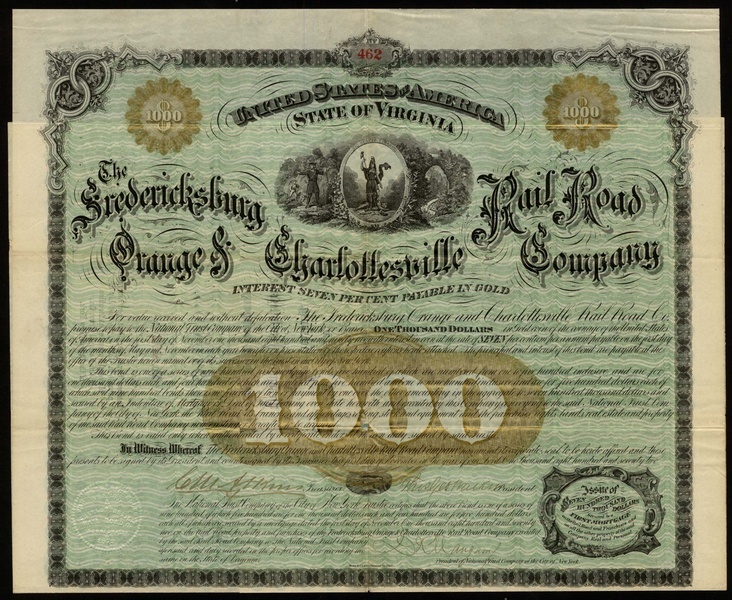 Fredericksburg, Orange and Charlottesville Rail Road Co., (VA), 7% first mortgage bond for $1000, 1872, no.462, Virginia state seal at top, ornate border with scrollwork, black with green and gold underprinting, with coupons, small hole in centre, otherwise about very fine.