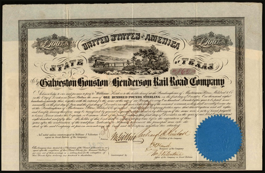 Galveston, Houston and Henderson Rail Road Co., (TX), bond for £100 sterling, 1853, no.862, steam train passing woodland at top, ornate border, black, together with; 10% land bond for $200, 1855, no.890, ornate border, black with green underprint, and, certificate for one obligation of $100, 1857, no.18593, ornate border, black, all with coupons, all very fine. (3)