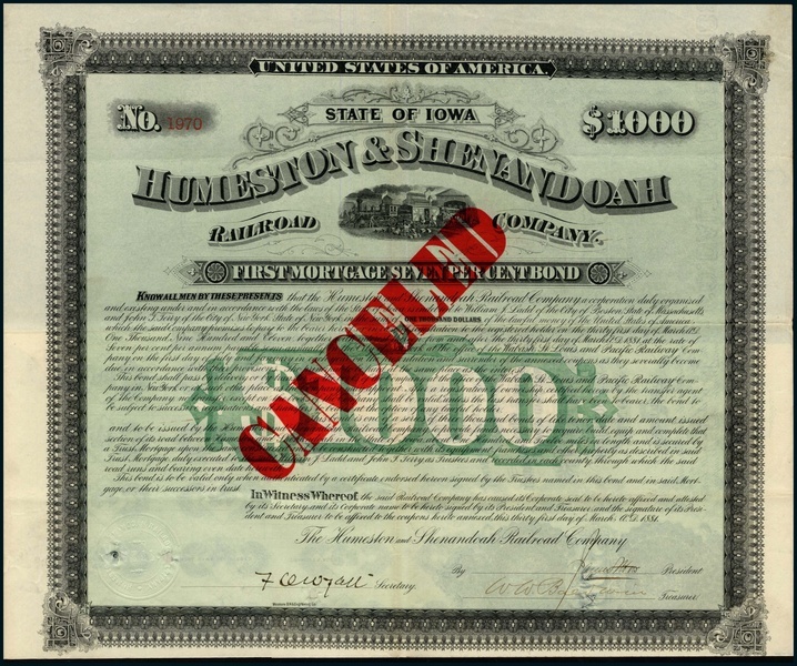 Humeston & Shenandoah Railroad Co., (IA), first mortgage 7% bond for $1000, 1881, no.1970, train being loaded at top, ornate border, black with green underprint, with coupons, stamped cancelled in red on face, very fine.
