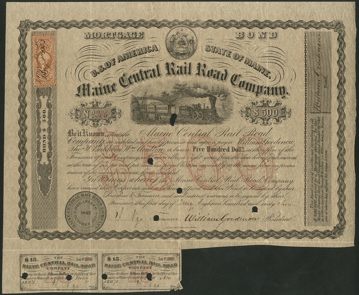 Maine Central Rail Road Co., (ME), mortgage bond for $500, 186[3], no.206, steam train in centre, decorative border, black with brown underprint, with coupons, very fine.