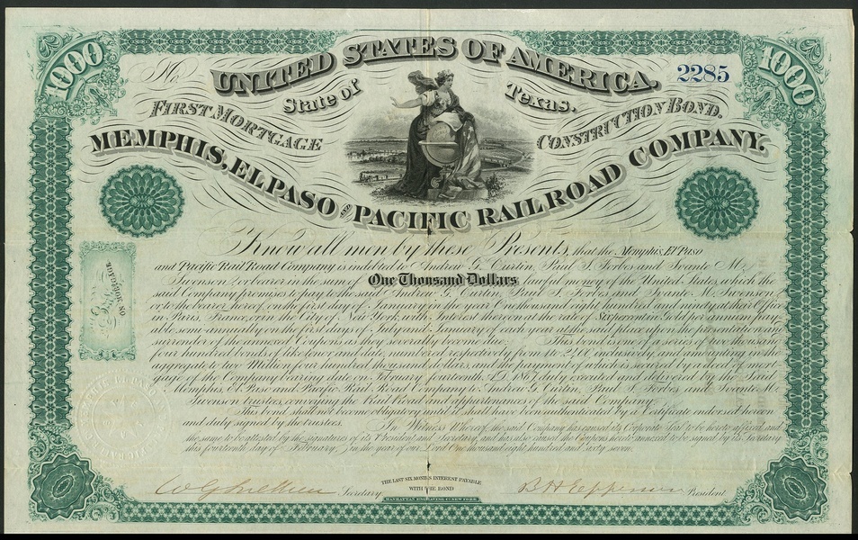 Memphis, El Paso and Pacific Rail Road Co., (TX), first mortgage construction bond for $1000, 1867, no.2285, allegorical female with globe at top, ornate border, black and green, with coupons, almost very fine.