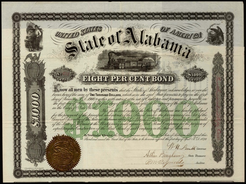 Montgomery and Eufaula Rail Road Co., 8% bond for $1000, issued by the State of Alabama, 1870, no.251, steam train passing under bridge at top, decorative border, black with green underprint, gold paper seal, with coupons, very fine.