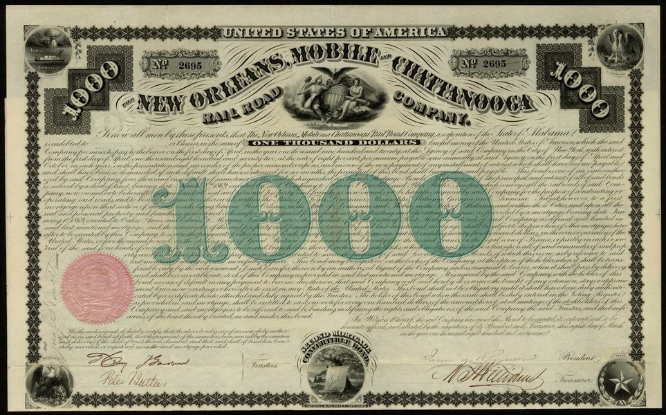 New Orleans, Mobile and Chattanooga Rail Road Co., (AL), second mortgage convertible bond for $1000, 1869, no.2695, allegorical females with eagle at top, Tennessee, Louisiana, Texas and Mississippi state seals in corners, black with green underprint, with coupons, very fine.