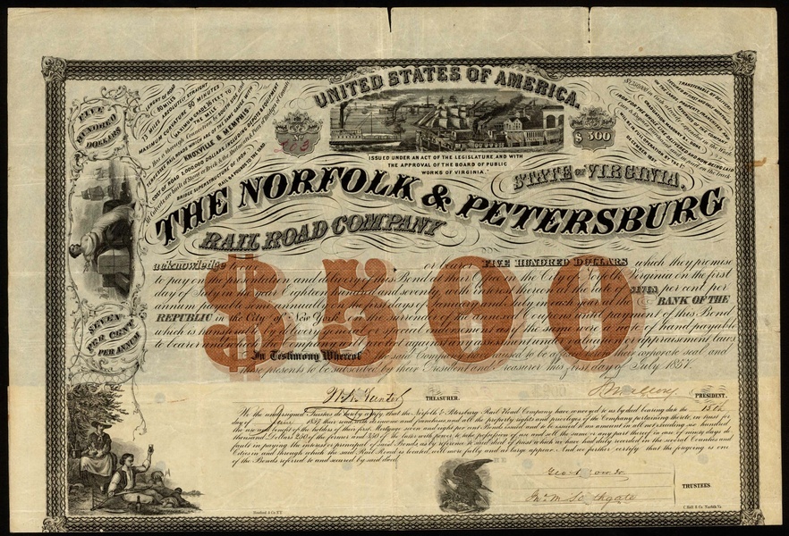 Norfolk and Petersburg Rail Road Co., (VA), 7% bond for $500, 1857, no.203, lovely vignettes of family at bottom left corner, allegorical female figure to left side, and dockside scene at top, black with brown underprint, with coupons, small tears to top edge, about very fine.