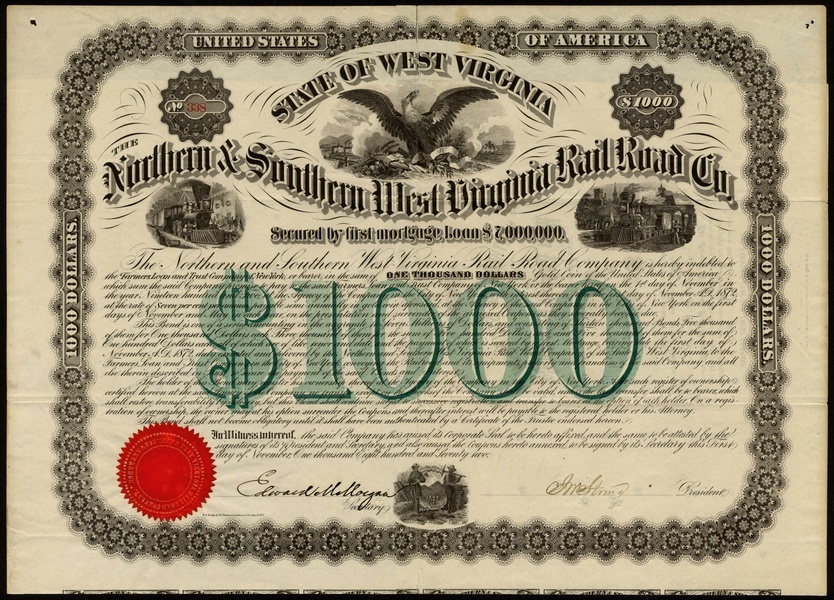 Northern & Southern West Virginia Rail Road Co., (WV), first mortgage bond for $1000, 1872, no.338, American eagle at top, and steam engines either side with state seal at bottom, decorative border, black and green, with coupons, hole cancelled, very fine.
