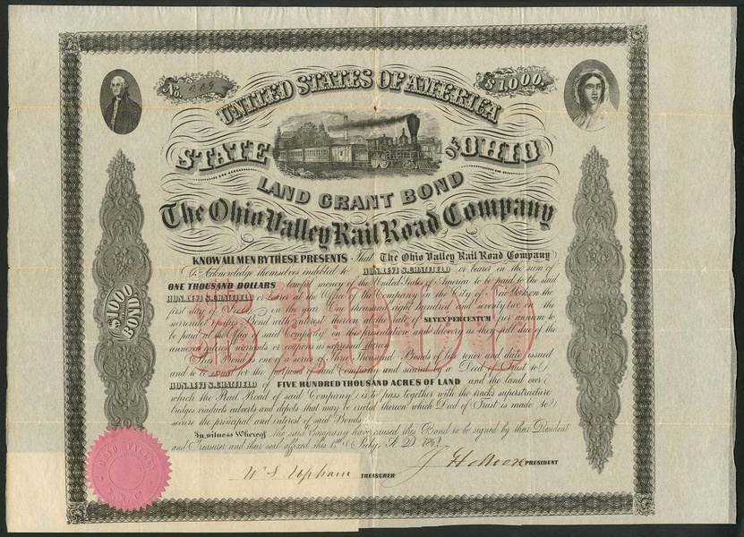 Ohio Valley Rail Road Co., (OH), 7% land grant bond for $1000, 1862, no.209, steam train at top and busts to left and right corners, black with pink underprint, pink paper seal, with coupons, very fine.