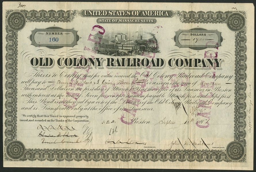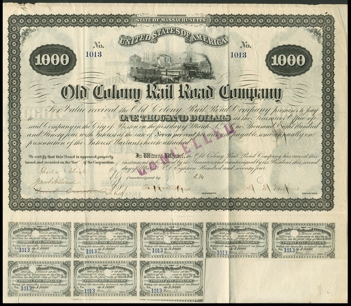 Old Colony Rail Road Corporation, certificate for capital stock, Boston 184[7], and, $500 share, 1854, also together with Old Colony Railroad Co., bond for $5000, 187[5]; bond for $1000, 1875; 4% bonds, [1892] and [1893]; $100 shares, 188[3], 18[90] and 18[91], and, $100 shares, 19[34], some pieces hole cancelled, very fine or thereabouts. (10)
