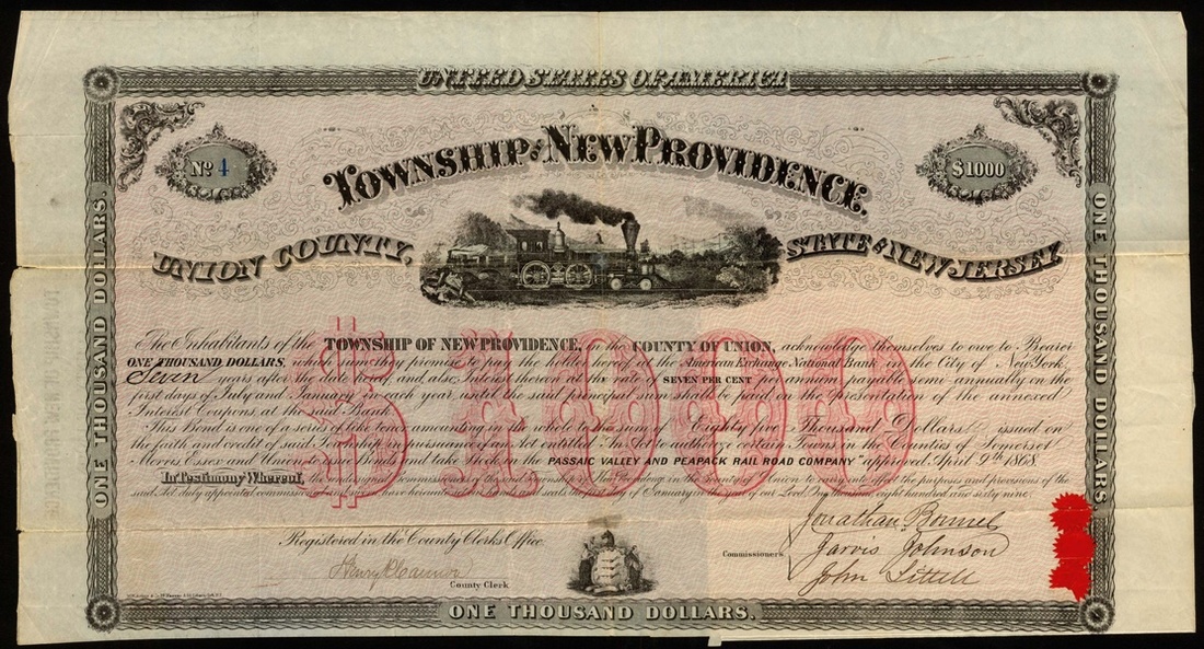 Passaic Valley and Peapack Railroad Co., $1000 bond, issued by the township of New Providence, Union County, New Jersey, 1869, no.4, of only 85 issued,ornate border and steam engine at top, black and pink, with coupons, about very fine.