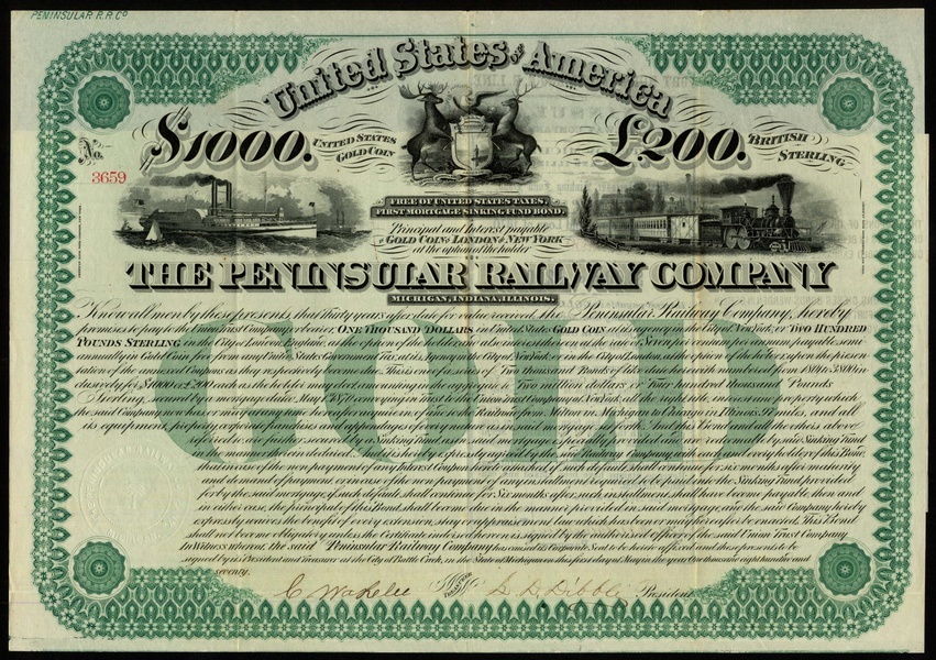 Peninsular Railway Co., (MI, IN, IL), first mortgage sinking fund bond for $1000 or £200, 1870, no.3659, paddle steamer and steam train to left and right, Michigan state seal above, black and green on green paper, with coupons, good very fine.