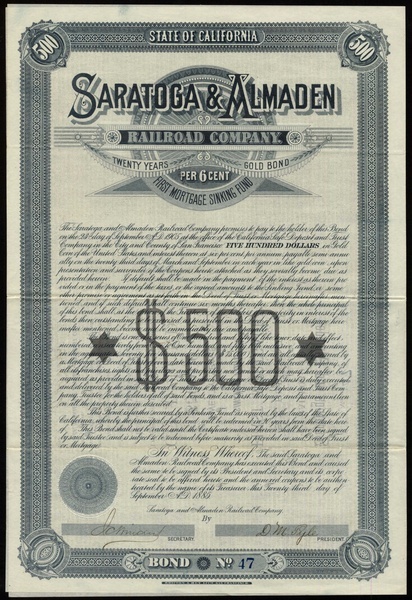 Saratoga & Almaden Railroad Co., (CA), 6% first mortgage sinking fund gold bond for $500, 1885, no.47, of only 150 issued, decorative border, grey printing, with coupons, good very fine.
