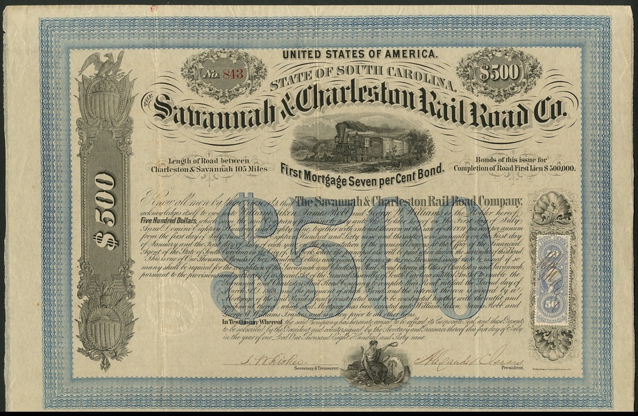 Savannah & Charleston Rail Road Co., (SC), first mortgage 7% bond for $500, 1869, no.843, steam train below title, ornate border, black with blue underprint, with coupons, very fine.