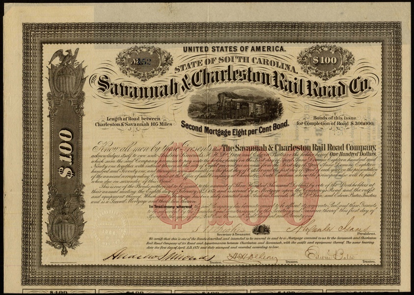 Savannah & Charleston Rail Road Co., (SC), second mortgage 8% bond for $100, 1871, no.152, steam train below title, ornate border, black with red underprint, with coupons, very fine.