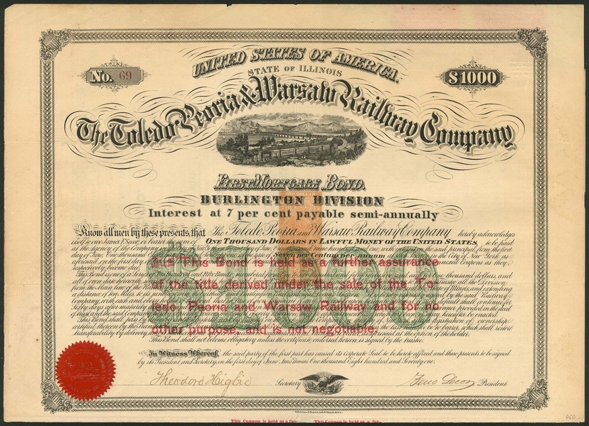 Toledo, Peoria & Warsaw Railway Co., (IL), 7% first mortgage bond (Burlington Division) for $1000, 1871, no.69, of only 250 issued, railway with river and mountains at top, black with green underprint, with coupons, tear on crease to top edge, otherwise very fine.