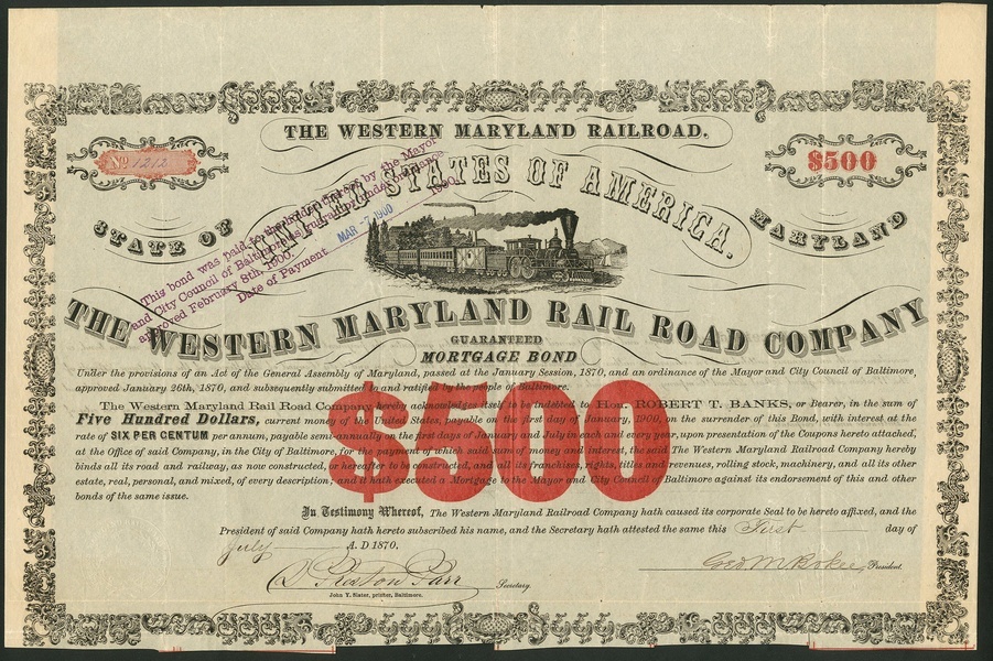 Western Maryland Rail Road Co., (MD), a group of certificates comprising; first mortgage bonds for $1000, $500 and $100, 1858, train at top, scrollwork border, black and red; second mortgage bonds for $500 and $1000, 18[68], train and agriculture, black and blue; preferred second mortgage bonds for $500 and $1000, 1868; guaranteed mortgage bonds for $500 and $1000, 1870, and, first mortgage 4% 50yr registered gold bond, [1917], most with coupons, very fine or thereabouts. (10)