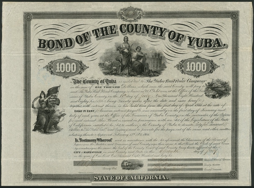 Yuba Railroad Co., (CA), 8% bond for $1000 issued by the County of Yuba, 1866, no.64, of only 65 issued, allegorical females at top and left, ornate border, black, with coupons, very fine amd rare.