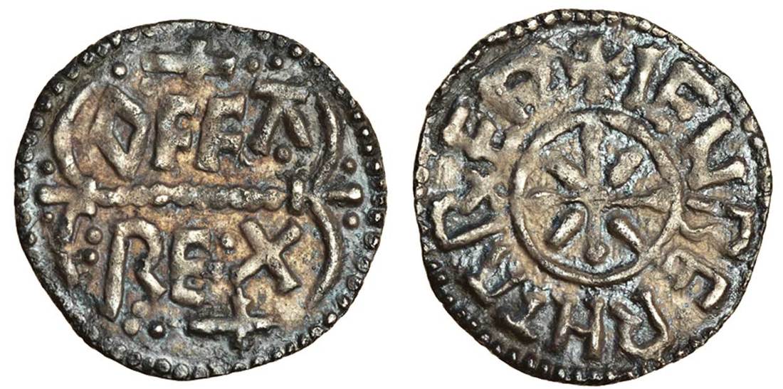Archbishops of Canterbury, Jaenberht (766-92), with Offa as overlord, after 775, Penny, 1.22g., Canterbury, OFFA REX, in two lines, divided by beaded bar terminating with fleurs, horizontal cross above, and below, rev. +IENBERHT AREP, small cross pommÉe within a petal in each angle within plain inner-circle (Chick 155d – this coin; N.2234; S.882), lightly toned, nearly very fine, a good example of this rare issue, extremely rare