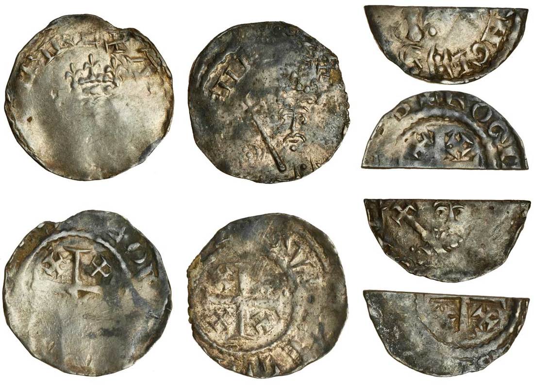 Henry II (1154-1189), ‘Tealby’ coinage, 1158-80, Pennies (2), class A2, Exeter, 1.37g, Edwid, [ ]edw[ ], two thirds flat, otherwise fine, 1.44g, Guncelin, [ ]gv[ ]celin[ ], flat in parts, good fine, Cut Halfpennies (2), class A1, Exeter, 0.60g, Ricard, [ ]ces[ ], fine, class A2, 0.66g, Rogier, +rogi[ ]s, mottled tone, good fine, (BMC ?, 265, 268, ?; N.952/2, the third N.952/1; S.1337), all rare coins from a rare mint (4)