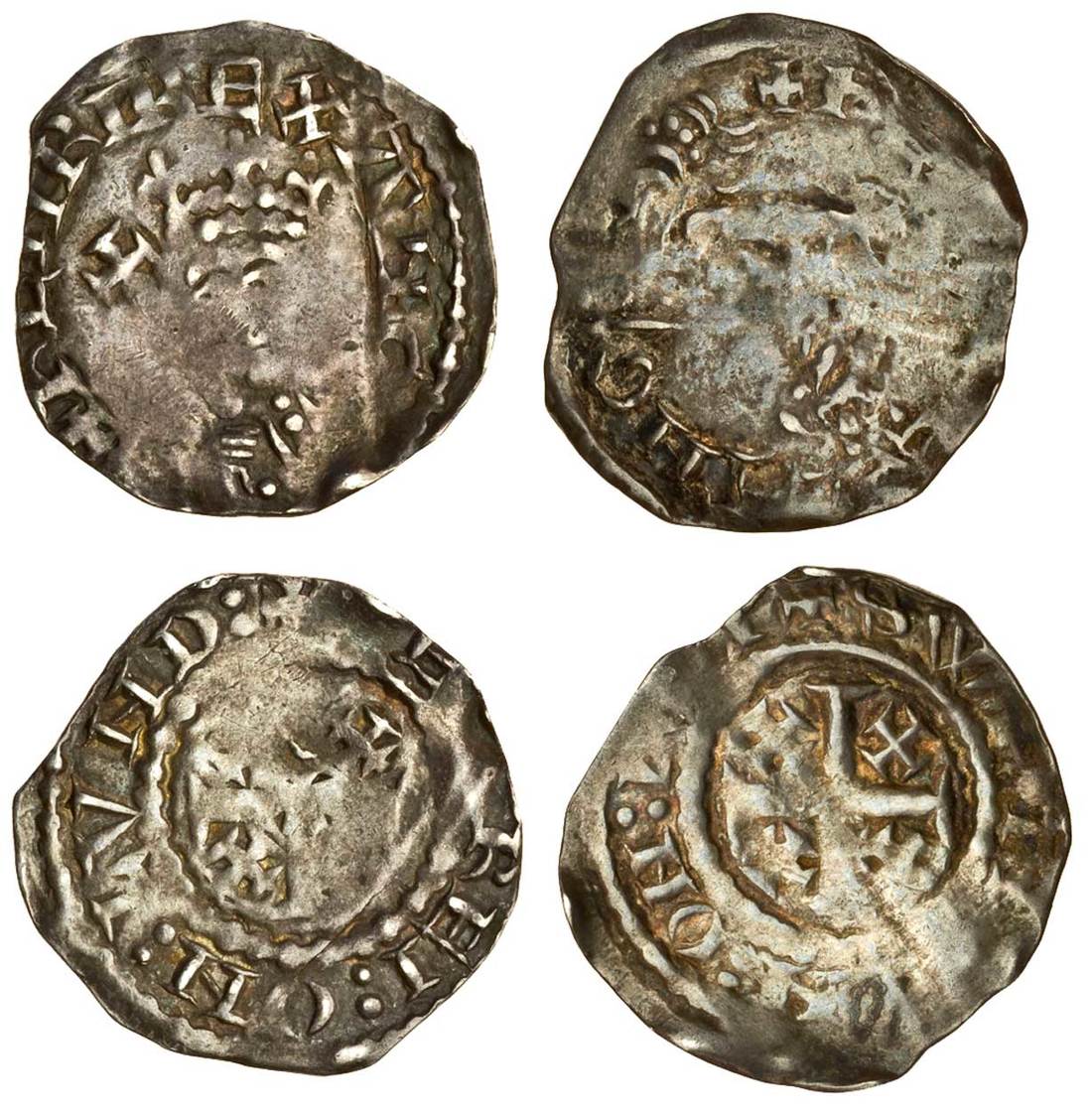 Henry II (1154-1189), ‘Tealby’ coinage, 1158-80, Pennies (2), London, class A1, 1.45g, Geffrei, rev. +[ ]e[ ]rei:on:lvnd, creased and straightened with crack to right of bust passing light, good legends, fine, class A2, 1.41g, Swetman, rev. +swet[ ]n:on:l[ ], creased and straightened, almost fine (BMC -, 563-5; N.952/1 and N.952/2; S.1337), the first rare (2)