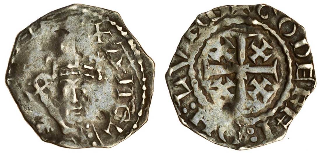 Henry II (1154-1189), ‘Tealby’ coinage, 1158-80, Penny, 1.47g, class A2, London, Godefrei, facing crowned bust, sceptre top left, rev. +godeffi:on:lvnd, cross potent with a small cross potent in each angle (BMC 478; N.952/2; S.1337), weak in parts of the obverse, the reverse well struck with a complete legend reading, fine, the reverse better