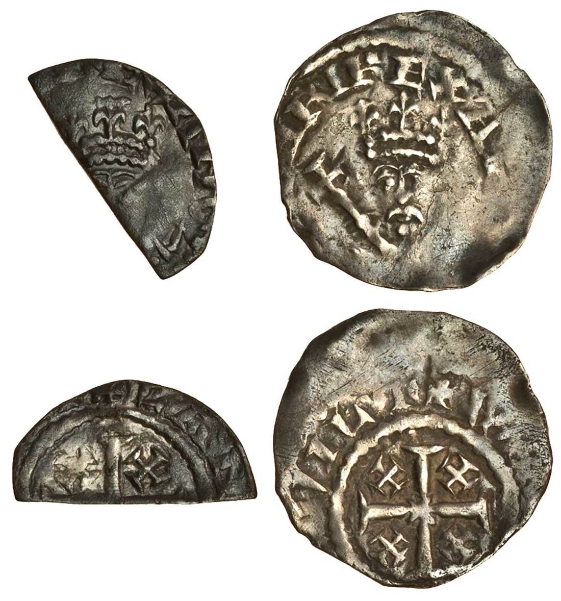 Henry II (1154-1189), ‘Tealby’ coinage, 1158-80, Cut Halfpenny (1), Penny (1), Wilton, class A1, 0.49g, Lantier, +lan[ ], well struck, dark tone, very fine, 1.40g, Willem, +w[ ]vilt, struck off-centre with a good portrait, almost very fine (BMC 753, 756; N.952/1, N.952/2; S.1337), a rare mint and the second an extremely rare moneyer (2)