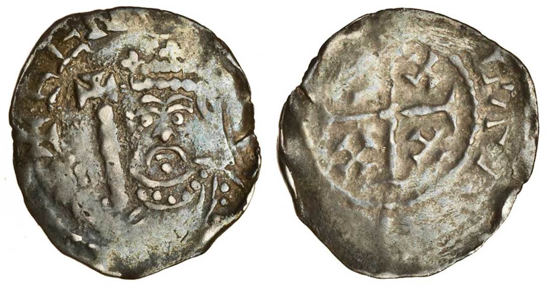 Henry II (1154-1189), ‘Tealby’ coinage, 1158-80, Penny, 1.41g, class E2, Bristol, Elaf, facing crowned bust, sceptre top left, the mantle sweeps from left shoulder across body, jewelled collar only, rev. [ ]laf[ ], cross potent with a small cross potent in each angle (BMC 10/-; N.960/2; S.1341), a decent portrait, this a pleasing fine, the reverse weak and only fair, but a very rare mint. The obverse die is known for Rogier.
