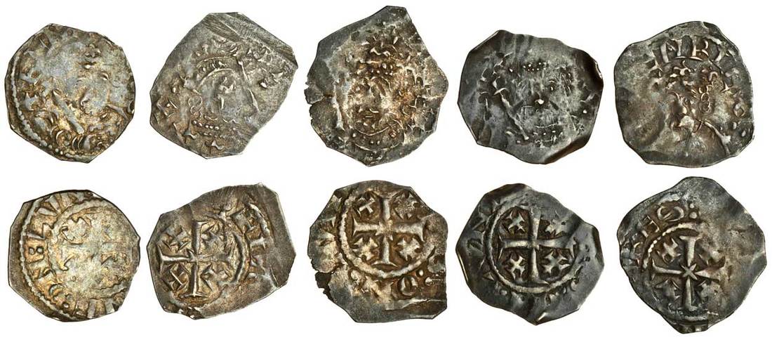 Henry II (1154-1189), ‘Tealby’ coinage, 1158-80, Pennies (5), London, class F, Alvine, 1.48g, obv. reads rexs, +[ ]ne:on:lvn, weak in parts, nearly fine, class F3, Iohan, 1.47g, +ia[ ], struck on a rectangular flan, almost fine, class F, Pieres (2), 1.54g, [ ]s:on:lvn, weak legends and an edge crack, toned, almost fine, 1.46g, [ ]s:on:lvnd, flat obverse, fair, the reverse better, Henri, 1.43g, obv. reads enriex:, rev. +[ ]eres:[ ], one third flat, otherwise nearly fine (BMC 509/-, 537/-, -, -/579, -/551; N.961, the second N.961/3; S.1342), the first is noted in BMC paired with a Lefwin reverse only, the second and fifth are rare varieties (5)