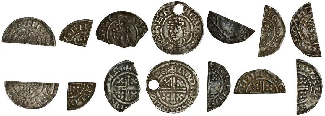 Henry II (1154-1189), ‘Short Cross’ coinage, 1180-89, Oddments (7), class 1aí1 (4), Exeter, Cut Halfpenny, 0.68g, Iordan, rev. [ ]dan•on[ ], Northampton, Cut Farthing, 0.38g, Willelm, rev. [ ]lelm[ ], Winchester, Pennies (2), 0.85g, Clement, rev. +c[ ]•on•winc, 1.28g, Rodbert, rev. +rodberd•on•w[ ]ce, class 1aí1/1aí2 (2), London, Cut Halfpennies, 0.58g, Alain V, rev. +alein•v[ ], 0.62g, Iefrei, rev, +ief[ ]vnd, 1aí1/1aí3, Northampton, Cut Halfpenny, 0.66g, Walter, rev, +walte[ ] (N.962; S.1343; Stewartby Ia1, Ia1/Ia2, Ia1/Ia3) the third a fragment, the fourth pierced, fine to almost very fine, all rare (7)