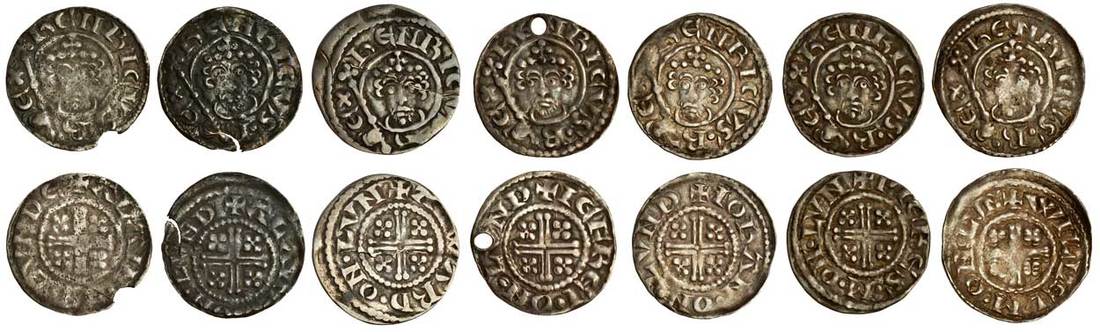 Henry II (1154-1189), ‘Short Cross’ coinage, 1180-89, Pennies (7), London, class 1bí1, 1.22g, Alain, rev. +alain•on•lvnde, chipped, fair, 1.28g, Alain V, rev. +alain•v•on•lvnd, edge crack, fine, rare, 1.40g, Alward, rev. +alward•on•lvn, cracked, good fine, a very rare moneyer, 1.37g, Iefrei, rev. +iefrei•on•lvnd, pierced, nearly very fine, 1.46g, Iohan, rev. +iohan•on•lvnd, toned, nearly very fine, 1.45g, Pieres M, rev. pieres•m•on•lvn, toned, nearly very fine, 1.47g, Willelm, rev. +willelm•on•lvn, a weak portrait, otherwise fine , (N.963; S.1344; Stewartby Ib1), the second and third rare (7)
