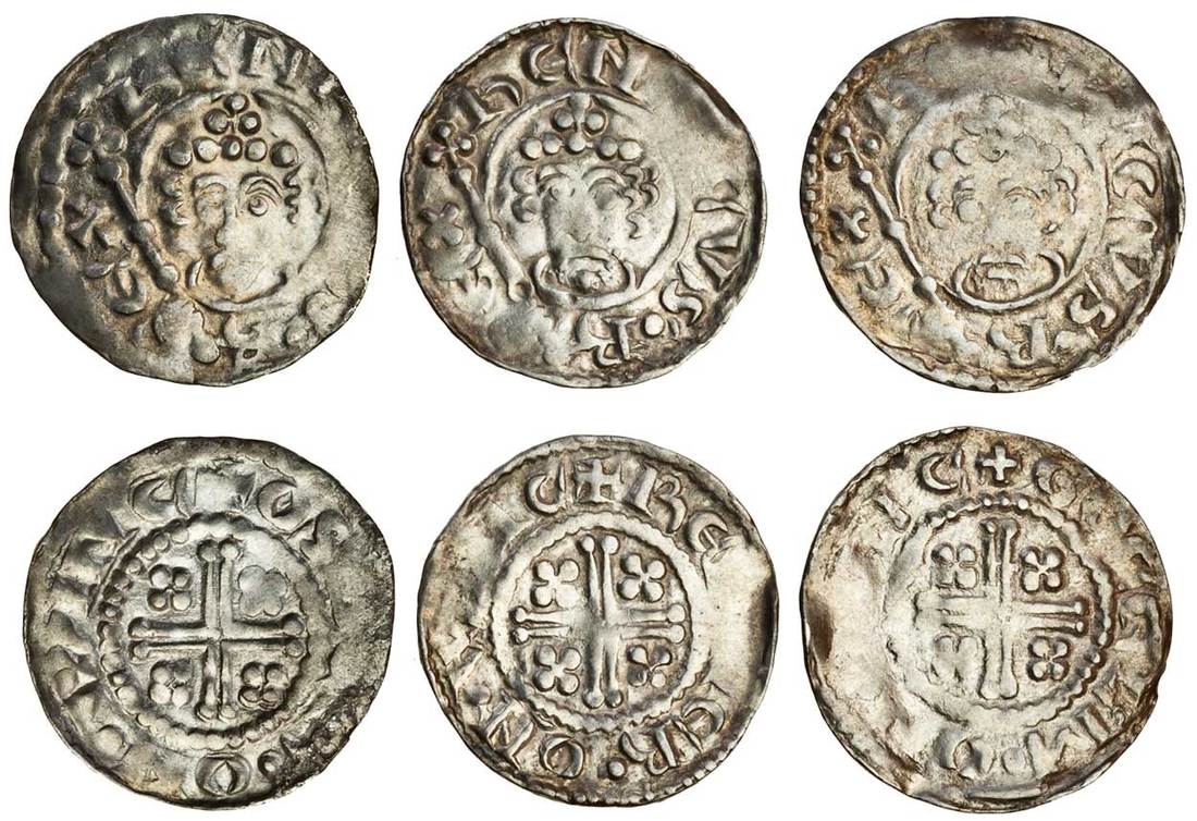 Henry II (1154-1189), ‘Short Cross’ coinage, 1180-89, Pennies (3), Winchester, class 1bí1 (2), 1.38g, Osber, rev. +osber•on•winc, nearly very fine, 1.48g, Reinier, rev. +re[ ]ier•on•w[ ]nc, good fine, (N.963; S.1344; Stewartby Ib1), class 1c, 1.44g, Gocelm, rev. +gocelm•on•[ ]nc, good fine (N.964; S.1345; Stewartby Ic), all bright, as is normal for this hoard (3)