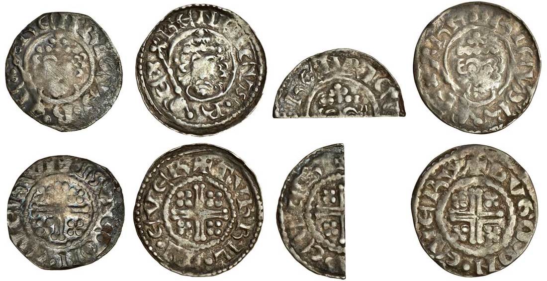 Henry II (1154-1189), ‘Short Cross’ coinage, 1180-89, Pennies (3), York, class 1bí1 (2), 1.09g, Isac, rev. +isac•on•everwi, a weak portrait, otherwise fine, 1.43g, Turkil, rev. +tvrkil•on•ever, weak at the centres, excess metal, almost very fine, Cut Halfpenny, class 1bí1, 0.63g, the obverse n is double barred, uncertain moneyer, rev. +[ ]n•ever, toned, good fine, rare (N.963; S.1344; Stewartby Ib1), Penny, class 1c, 1.39g, Hvgo, rev. +hvgo•on•everw, general wear, about fine (N.964; S.1345; Stewartby Ic), Mass makes no reference to double barred Ns in his works, so presumably a new die for this mint and worthy of further research. York is a scarce mint. (4)