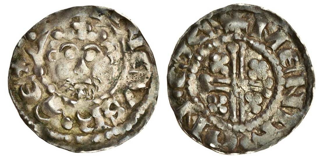 Richard I (1189-1199), ‘Short Cross’ coinage, Penny, 1.42g, class 2, Canterbury, Meinir, bust facing of round style, crowned and with sceptre, rev. +menir•on•can, short cross voided with quatrefoil in each angle, toned, very fine (N.965; S.1346; Stewartby II), a much better portrait than usually seen for this reign, rare