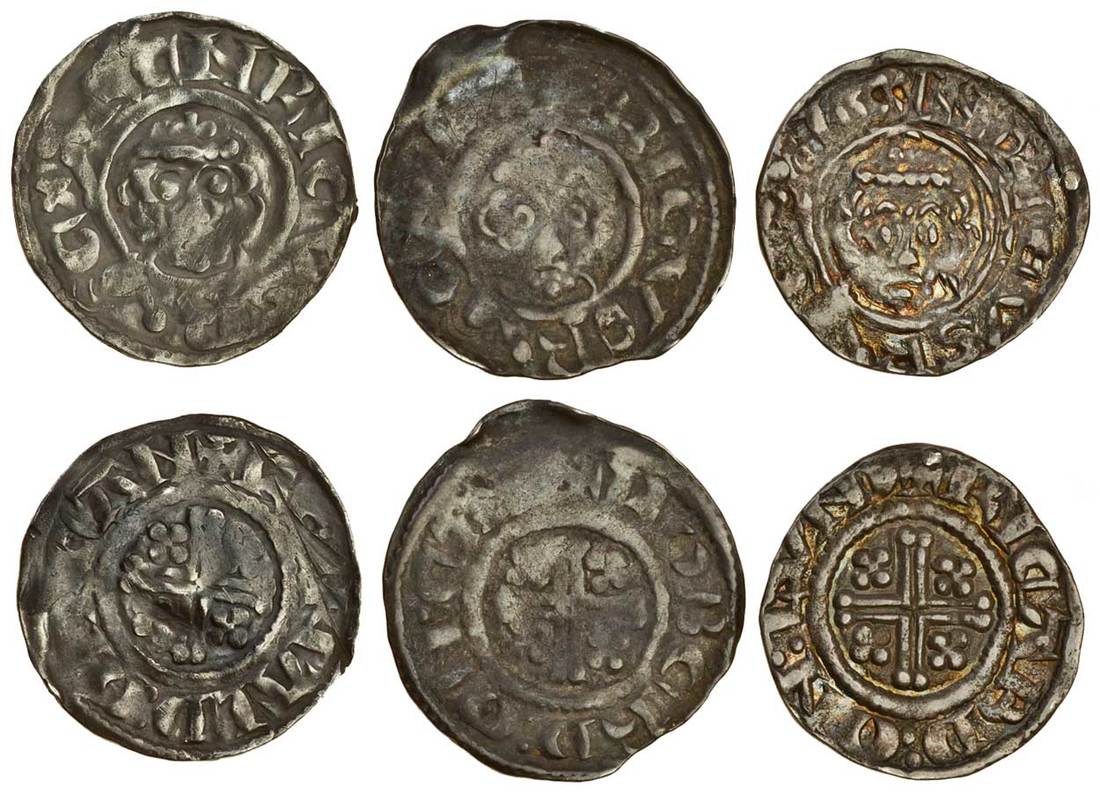 Richard I (1189-1199), ‘Short Cross’ coinage, Pennies (3), class 4a*, Canterbury (2), 1.32g, Reinald, rev. +reinald:on:can, reverse legend with colon stops, scratches to both sides, about fine, 1.44g, Roberd, rev. +roberd•on•can, irregular flan, near fine, London, 1.34g, Ricard, rev. +ricard:on:lvnd, attractively toned and very fine, but pierced and plugged (N.966; S.1348B; Stewartby IVa), all scarce (3)