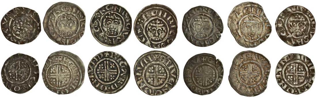 Richard I (1189-1199), ‘Short Cross’ coinage, Pennies (7), class 4a, London, Aimer, 0.79g, rev. +aimer•on•l[ ], Henri, 1.40g, rev. +henri•on•lvnd:, Ricard, 1.38g, rev. +ricard•on•lvnd, Stivene (2), 1.23g, +stivene•on•lvn, 1.51g, -.on•lv, Willelm (2), 1.48g, rev. +willelm•on•lvn, 1.02g, -on•lvnd (N.968/1; S.1348A; Stewartby IVa), the sixth good fine, otherwise fair to fine (7)