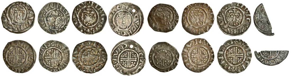Richard I (1189-1199), ‘Short Cross’ coinage, Pennies (7), class 4a, London, Aimer, 1.20g, rev. +aimer•on [ ]dei, good fine, Henri, 1.06g, rev. +henri•on•lvnd, about fine, Ricard (2), 1.22g, rev. +ricard•on•lvnd•, fine, 1.30g, obv. henricvsre/ex, rev. –lvnd, fine, Stivene, 0.96g, +stivene[ ]n•lvn, about fine, Willelm (2), 1.23g, 1.46g, rev. +willelm•on•lvn, both fine, Cut Halfpenny, class 4a, London, Henri, 0.50g, rev. [ ]nri•on[ ], good fine (N.968/1; S.1348A; Stewartby IVa), the first, second, fifth and sixth clipped, the fourth pierced (8)