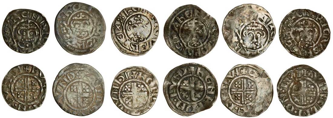 Richard I (1189-1199), ‘Short Cross’ coinage, Pennies (6), London, class 4b, Fvlke (2), 1.34g, rev. +fvlke•on•lvndi, small, toned, nearly very fine, 1.29g, rev. +fvike•on•lvnd, worn, nearly fine, the initial cross on the reverse is a cross pommée, Henri (2), 1.15g, rev. +henri•on•lvndi, flat in parts, near fine, 1.34g, rev. +henri•on•lvnd, wavy flan, the N of ON is double barred, near fine, Stivene, 1.38g, obv. henrecvs/rx, rev. +st[ ]ne•on•lvn, flat in parts, fine, Willelm, 1.17g, rev. +willelm•on•lvn, fair/almost fine (N.968/2; S.1348C; Stewartby IVb), the second rare with the cross pommée in the legend, the third an unusual obverse reading, an interesting group (6)