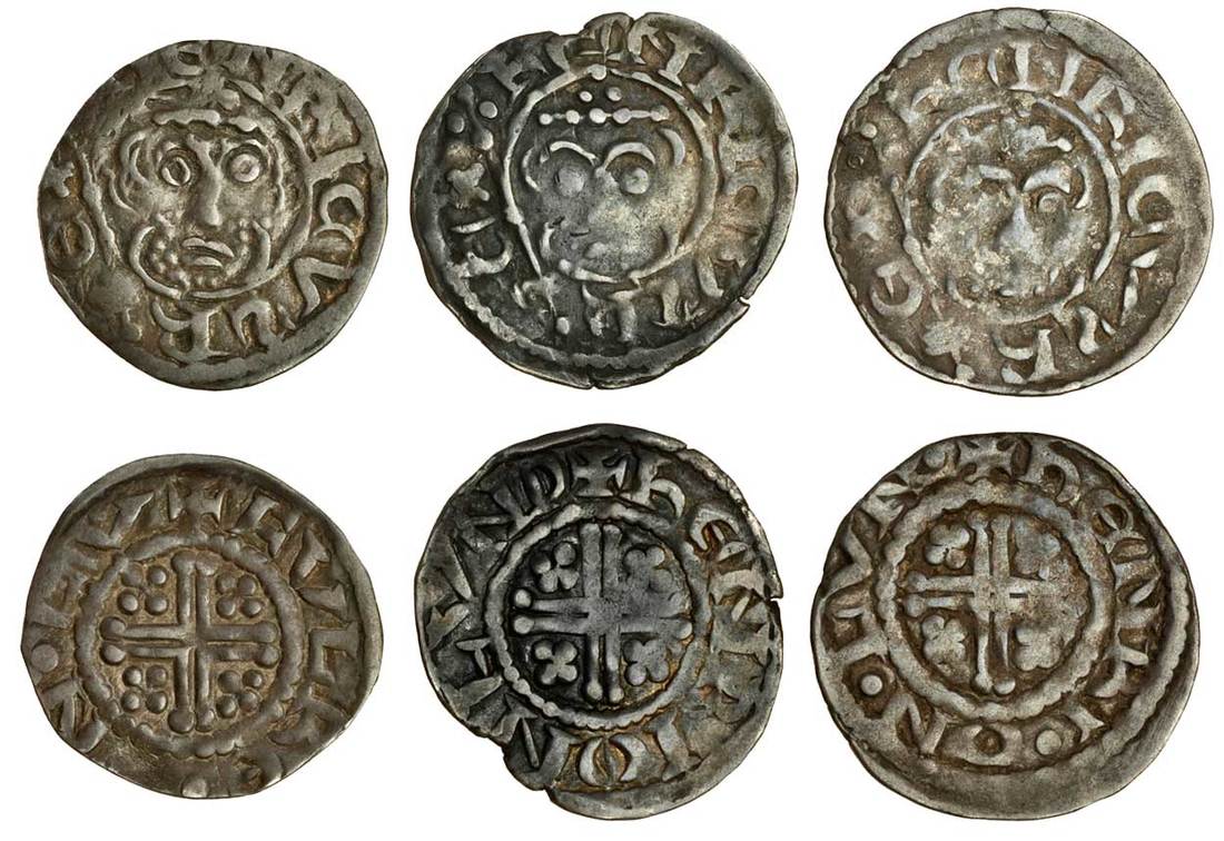 John (1199-1216), ‘Short Cross’ coinage, Penny, 1.19g, class 4c (3), London, Fvlke, bust of coarser work, reversed S in legend, rev. +fvlke•on•lv, short cross voided with quatrefoil in each angle (N.968/3; S.1349), slightly flat at one point of the reverse legend, good fine or better, Henri (2), 1.35g, rev. +henri•on•lvnd, slightly irregular, good fine, 1.39g, +henri•on•lvn, nearly fine (N.968/3; S.1349; the first, BNJ vol.11 pl.III/23 this coin; Stewartby IVc), all very rare (3)
