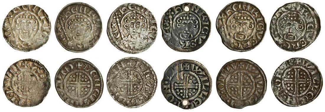 John (1199-1216), ‘Short Cross’ coinage, Pennies (6), class 5bí1, London, 1.49g, Abel, rev., +ab[ ]nn•lvn, unevenly struck, almost fine, 1.41g, Beneit, rev. +beneit•on•lvnd, almost fine, 1.37g, Ricard, rev. +ricard•on[ ]n, flat in parts, otherwise good fine, 1.33g, Willelm, rev. +willelm•on•lvn, good fine, Willelm B (2), rev. +willelm•b•on•lv, 1.45g, nearly very fine, 1.34g, fine (N.970; S.1351; Stewartby Vb1), the fourth pierced, the last cracked (6)