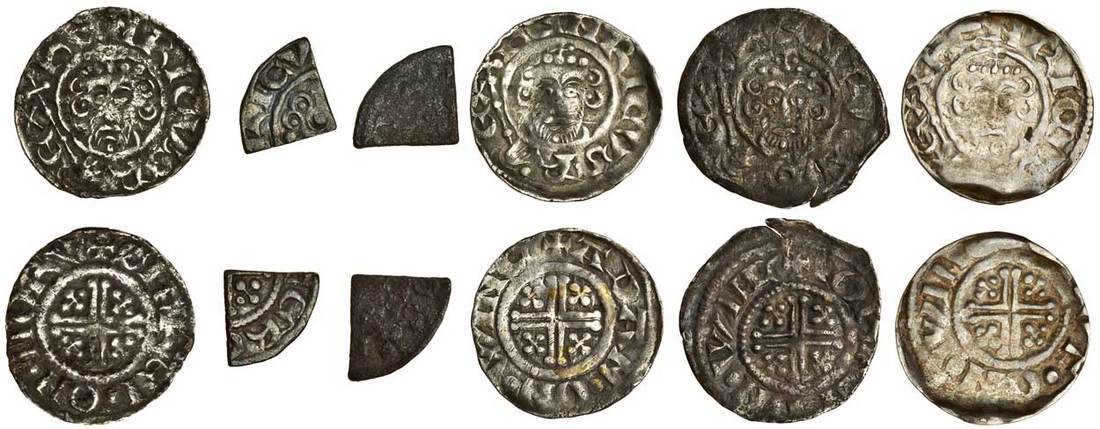 John (1199-1216), ‘Short Cross’ coinage, Penny, class 5c, Norwich, 1.04g, Gifrei, rev. +gifrei•on•norv, porous and cracked, good fine or better, Cut Farthings (2), 0.35g, Gifrei rev. [ ]gife[ ], nearly very fine, Norwich?, indistinct legends, fair, Winchester, Pennies (3), Class 5c, 1.35g, Adam, rev. +adam•on•winc, scuffed on the obverse, lacquer deposits on the reverse, fine, 1.28g, Iohan, rev. +iohan•on•winc, porous, good fine, 1.36g, Ravf, rev. [ ]avf•on•winc, almost fine (N.971; S.1352; the first SCBI 56/1721 and Allen dies 17/g8 this coin, the fourth SCBI 56/1728, the fifth SCBI 56/1732 and the sixth SCBI 56/1735 these coins; Stewartby Vc), the first rare (6)