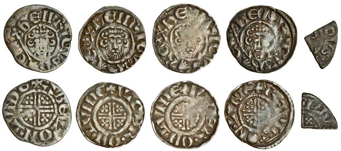 John (1199-1216), ‘Short Cross’ Coinage, Pennies (4), London, class 6bí2, 1.22g, Abel, rev. +abel•on•lvnde, edge crack and a flat portrait, otherwise fine, the reverse better, Ilger (2), 1.31g, +ilger•on•lvnde, a good portrait, very fine, 1.54g, obv. reads /rex, flat in parts, otherwise good fine, Ravf, 1.49g, rev. +ravlf•on•lvnde, a small flat spot, otherwise very fine with an attractive dark tone, Cut Halfpenny, Ilger, 0.31g, obv. evs•r, rev. +ilg[ ], about fine (N.975/2; S.1354; Stewartby VIb2), the third rare with REX in full after the sceptre, the last an unusual reading, but clear. (5)