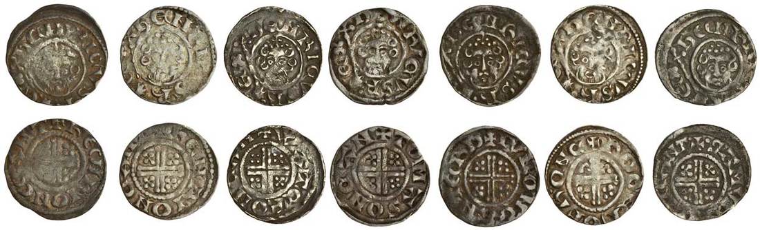 Henry III (1216-1272), ‘Short Cross’ Coinage, Pennies (7), Canterbury, Class 7a(A) (3), Henri (2), 1.42g and 1.39g, rev. +henrioncant, both weak centres, fair to fine, Walter, 1.39g, rev. +wateroncan, scuff to the face, good fine, the reverse nearly very fine, Class 7a(B), Tomas, 1.20g, rev. +tomasoncan, cracked, fine, the reverse better, Class 7a(C), Hivn, 1.36g, rev. +ivnoncanterd, darkly toned with residual deposits, good fine, Class 7a(D) (2), Roger of R, 1.34g, rev. +rogerofr•onc, some weakness, fine, Samvel, 1.50g, rev. +•samve[ ]onca•nt•, struck off-centre, the detail good, nearly very fine (N.978; S.1356A; Stewartby VIIa1,VIIa2, VIIa3), the first coin has ornamental lettering, the fourth an unusual reading for the mint name (7)