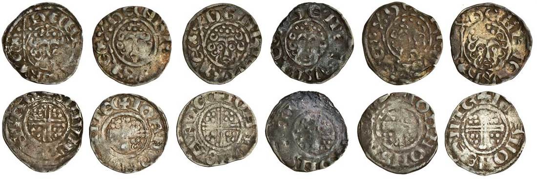 Henry III (1216-1272), ‘Short Cross’ Coinage, Pennies (6), Bury St. Edmunds, Class 7c(A) (1), degraded portrait, Simund, 1.42g, rev. +sihvndonsan, about fine, Class 7c(B) (4), Ioan (4), 1.44g, rev. +ioanon[ ]nte, fine, 1.43g, rev. +ioanonsante•, fine, 1.35g, rev. +[ ]nonsante, corroded, fair, 1.34g, rev. +ioanonsante, small edge split, near fine, Class 7c(C) (1), Ioan, 1.42g, rev. +ioanonsante, fine (N.980; S.1356C; VIIc1, VIIc2, VIIc3), the first and last both rare (6)