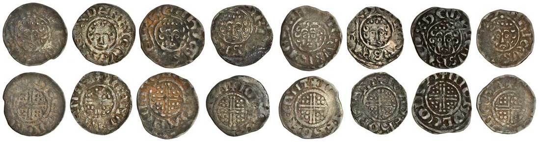 Henry III (1216-1272), ‘Short Cross’ Coinage, Pennies (8), Canterbury, Class 7c(A) (8), Henri, 1.38g, rev. +henrion[ ]an[ ], near fine, Ioan, 1.43g, rev. +ioanoncante, about fine, Ioan Chic (2), 1.33g, rev. +ioanchiconca, deposits, about fine, 1.33g, rev. +ioanc[ ]nca, struck off-centre, fair-fine, Ioan F R (2), 1.34g, rev. +io[ ]f•roncant, partly flat, near fine, 1.50g, rev. +ioan•f•r•oncant, dark tone, almost very fine, Nichole (2), 1.53g, rev. +nicholeonca, dark tone, nearly very fine, 1.48g, +n[ ]oleoncan, flat in parts, otherwise fine (N.980; S.1356C; Stewartby VIIc1), the second with pellets in the hair curls, some scarce or rare (8)